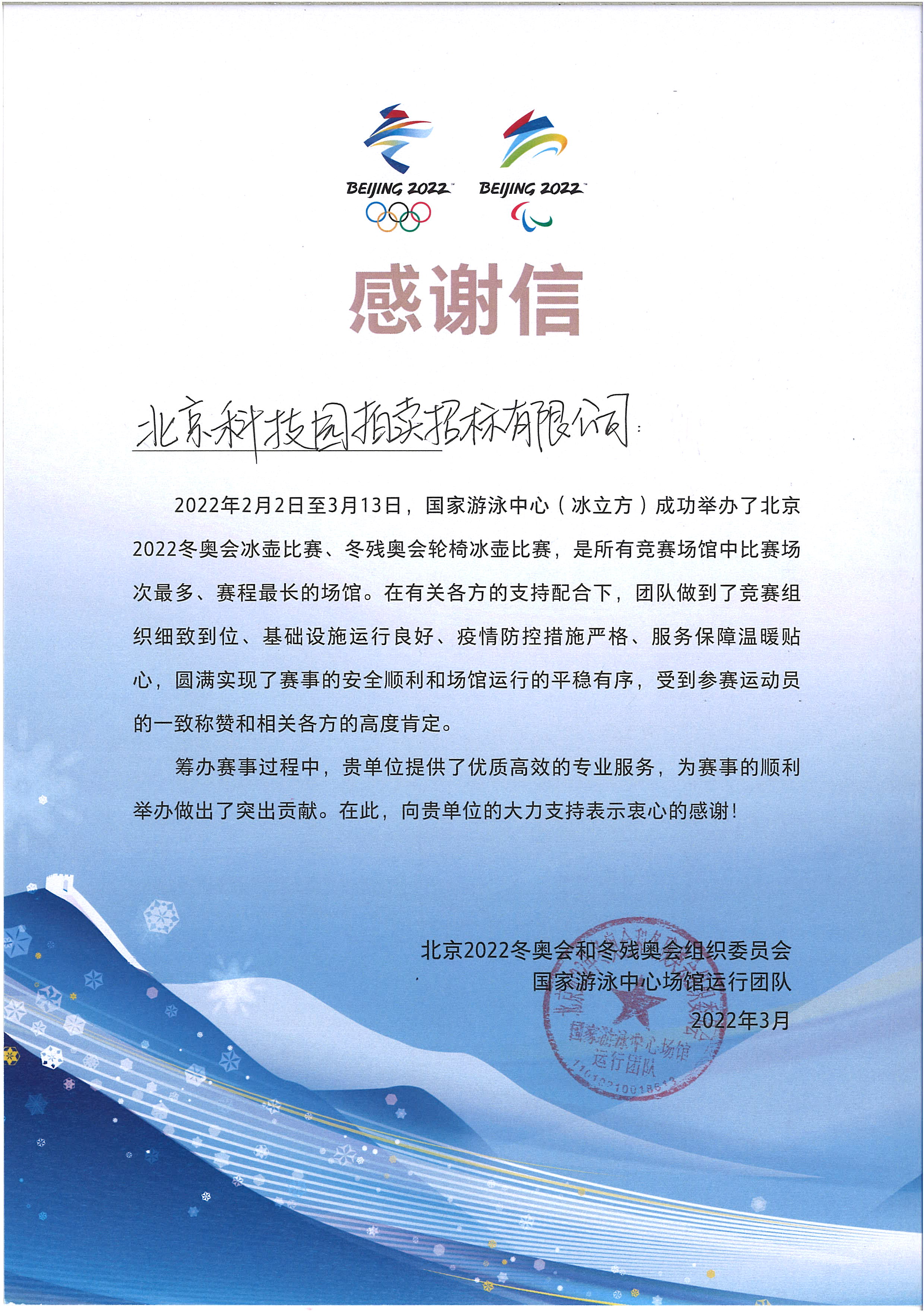 國家游泳中心場館運行團隊感謝信