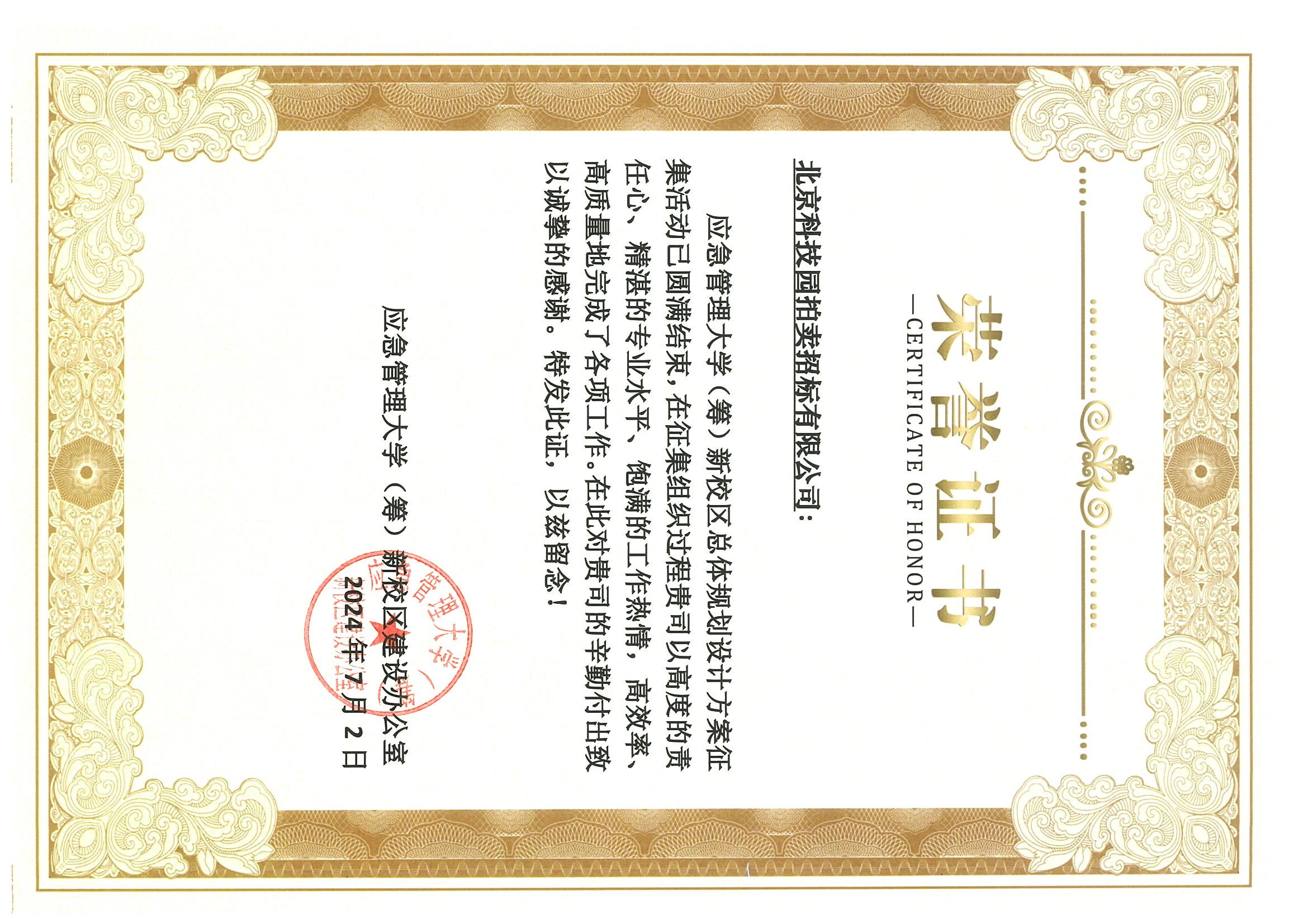 應急管理大學(籌)新校區總體規劃設計方案征集榮譽證書