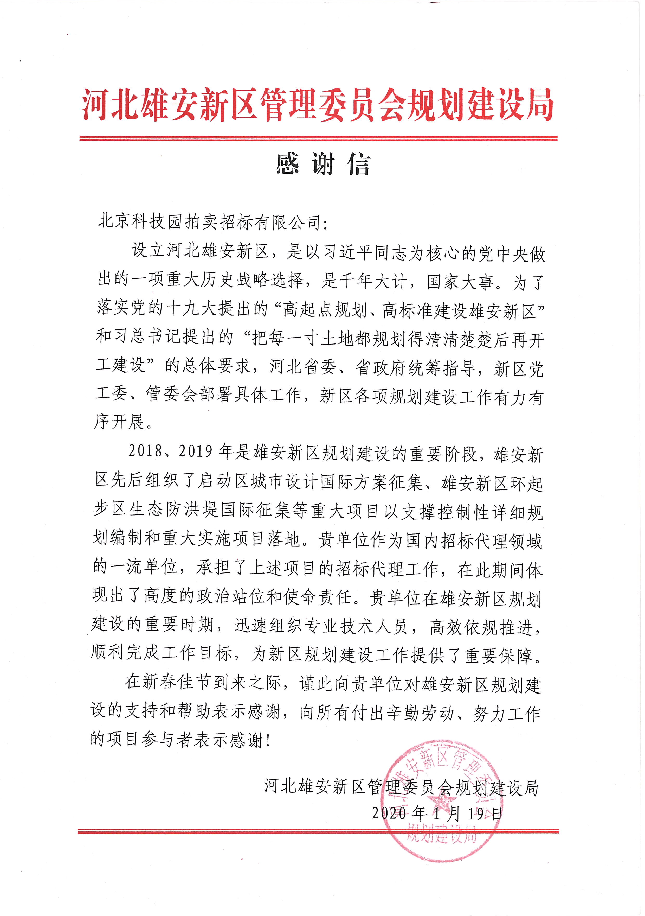 雄安新區管委會規建局感謝信