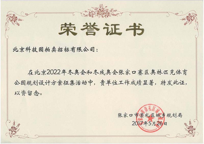 2022冬奧會和動殘奧會張家口賽區奧林匹克體育公園規劃設計方案征集榮譽證書