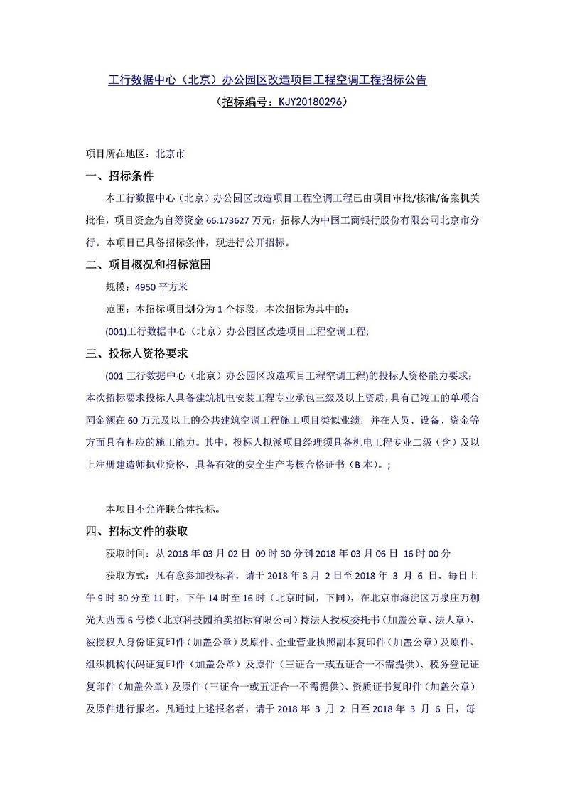 工行數據中心(北京)辦公園區改造項目工程空調工程招標公告
