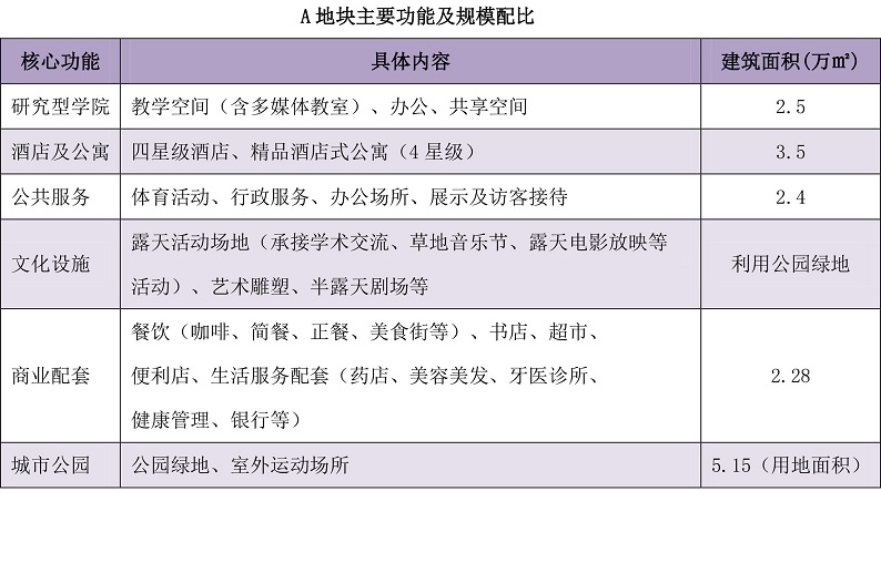 核心功能:研究型學院、酒店及酒店式公寓、公共服務、文化設施、配套商業、城市公園。