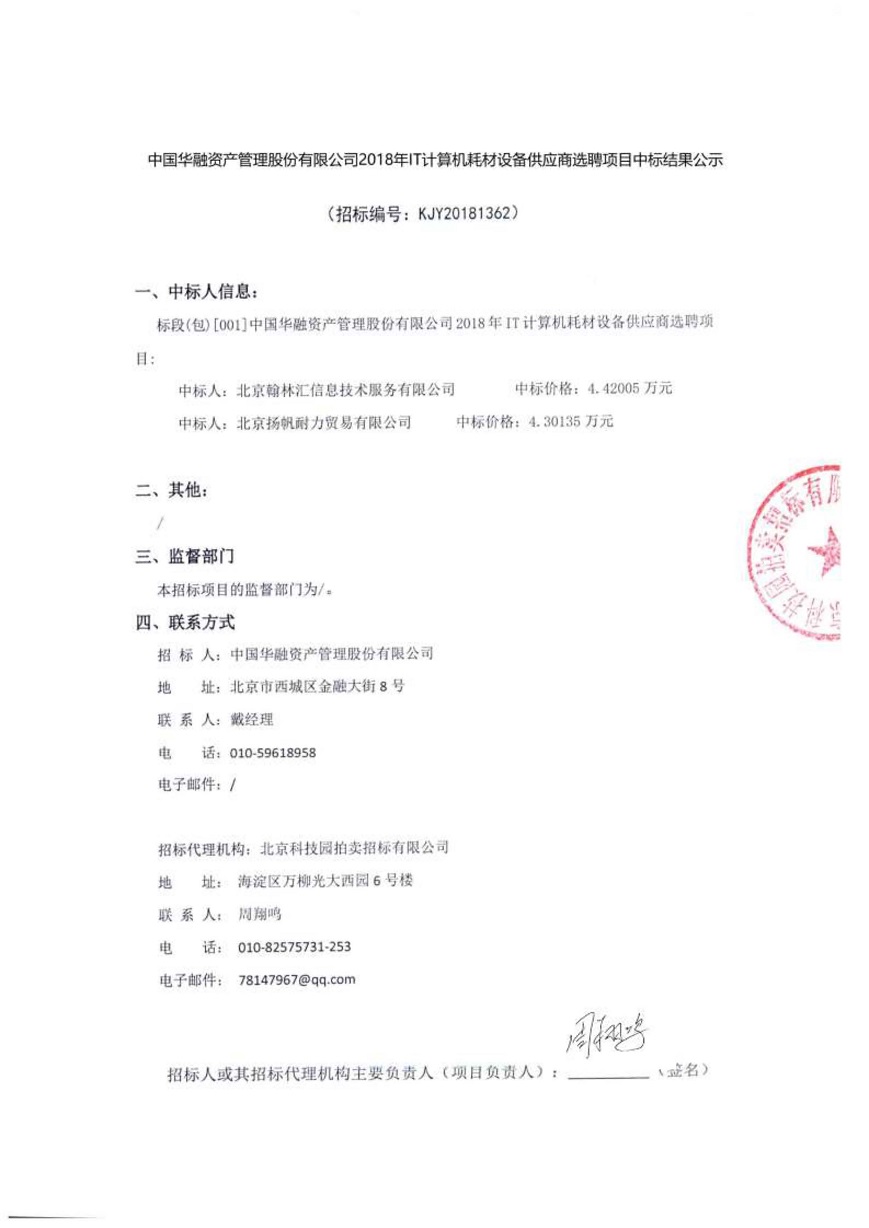中國華融資產管理股份有限公司2018年IT計算機耗材設備供應商選聘項目中標結果公示