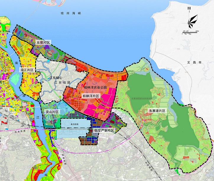 江東新區位于??跂|海岸區域,東起東寨港(??谛姓吔纾?,西至南渡江,北臨東海岸線,南至繞城高速二期和212省道,總用地面積約298平方公里,分為東部生態功能區和西部產城融合區。其中東部生態功能區約106平方公里,包含33平方公里的國際重要濕地東寨港國家級自然保護區;西部產城融合區約192平方公里,包含沿江生活片區、桂林洋高校片區及臨空產業園片區等。